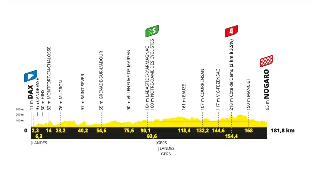 Mardi, la 4e étape du Tour de France va mener les coureurs de Dax à Nogaro, sur les routes des Landes et du Gers. Au programme de l'étape du jour, c'est un parcours de 181,8 kilomètres qui attend le peloton avec un profil de 1.427 mètres de dénivelé positif et une seule ascension répertoriée, à savoir la Côte de Demu, située dans la partie finale.