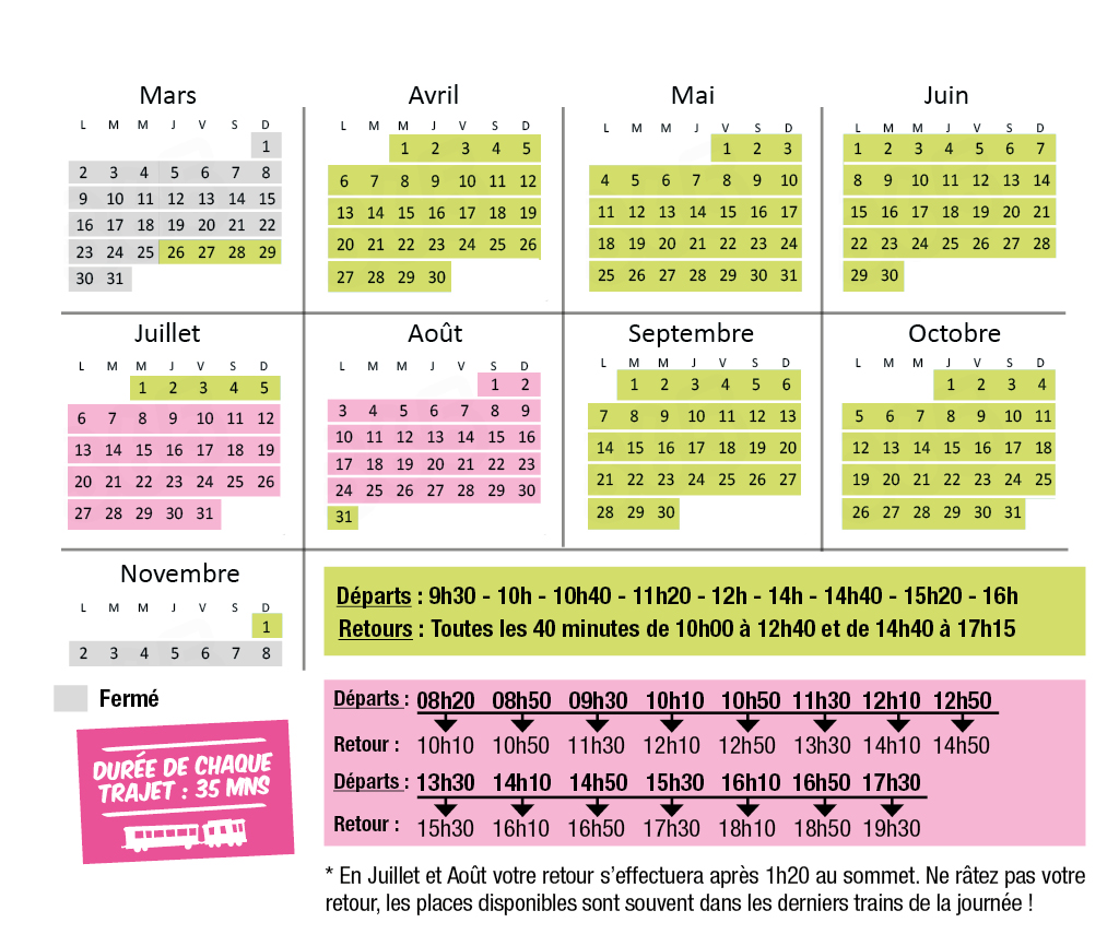 Horaires 2024. Attention, le train de la Rhune est fermé l'hiver (de novembre à février environ). Il circule tous les jours tout le reste de l'année. Compter un train toutes les 40 minutes entre 9h30 et 16h en basse saison, et entre 8h20 et 17h30 (dernier retour à 20h30 voire 21h) en juillet et en août. L'ascension dure environ 40.
