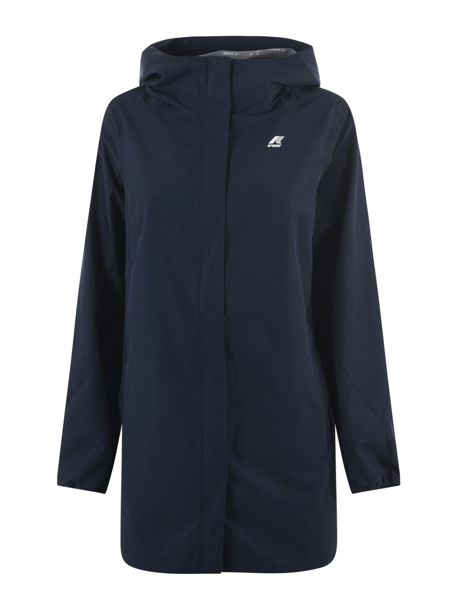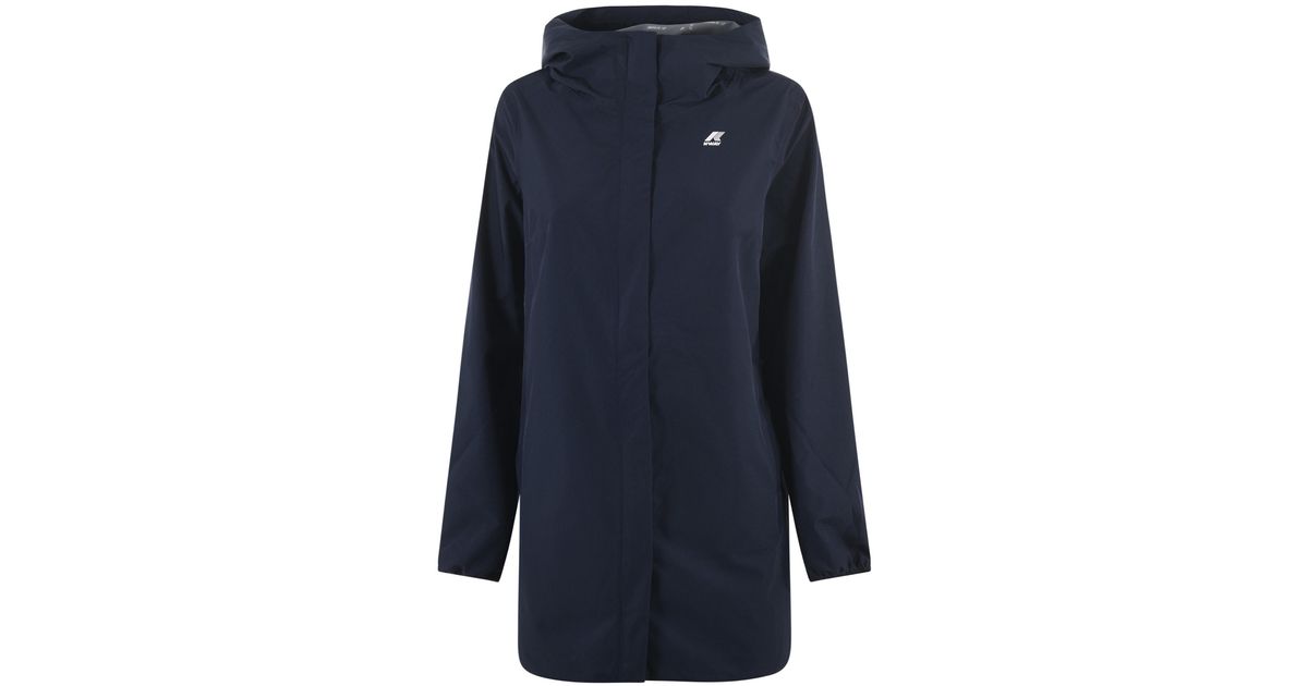 Product Description. Sophie is a women's three-quarter length jacket characterised by a slim fit that contours the silhouette. Made from recycled stretch fabric that offers protection against wind and rain, with water resistance up to 5000mm, its design is enhanced with an insulating inner membrane, printed with all-over silver K-Way lettering.