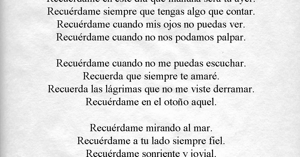 Recuérdame, hoy me tengo que ir mi amor Recuérdame, no llores por favor Te llevo en mi corazón y cerca me tendrás. A solas yo te cantaré, soñando en regresar Recuérdame, aunque tenga que emigrar Recuérdame, si mi guitarra oyes llorar Ella con su triste canto te acompañará Hasta que en mis brazos estés Recuérdame Recuérdame, hoy me.