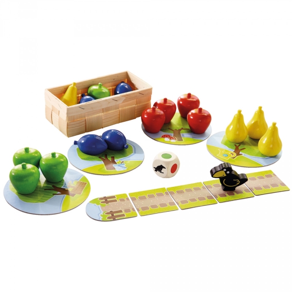 Idée : Anneliese Farkaschovsky Illustration : Jutta Neundorfer Contenu du jeu : 1 corbeau, 1 panier pour fruits, 4 pommes vertes, 4 pommes rouges, 4 poires jaunes, 4 prunes bleues, 5 cartes de chemin, 4 arbres, 1 dé avec symboles et